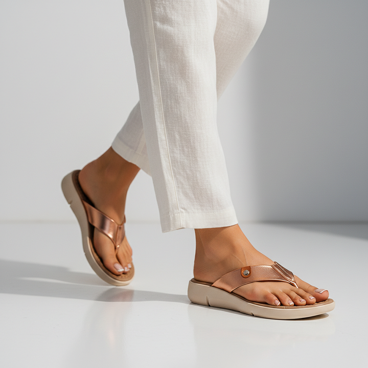 Descubre la comodidad que mereces con la Sandalia oro rosa ADDIC. Su plantilla EVA proporciona un masaje suave que favorece la circulación sanguínea, permitiéndote disfrutar de un descanso continuo. El diseño texturizado de la capellada garantiza un ajuste seguro y ligero, mientras que la suela antideslizante te mantiene estable en cada movimiento. Perfecta para quienes valoran el bienestar sin sacrificar el estilo, esta sandalia te acompaña con confianza en tu día a día.